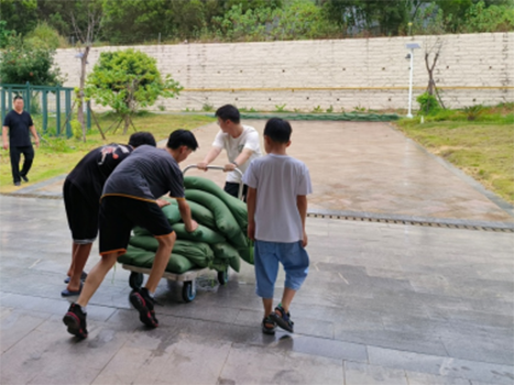 中心儿童在得知此次台风来势凶猛后,也主动帮助工作人员做好院内树木加固、清沟、堆垒沙袋、做好奶粉、粮油、蔬菜、药品等医疗生活物资以及雨衣雨靴、安全帽、手电筒、应急灯、喊话器等应急抢险物资的清点和储备工作。孩子们以小主人翁的姿态,身体力行地加入到防抗台风行动中,用爱心共同守家园,确保家人平安。