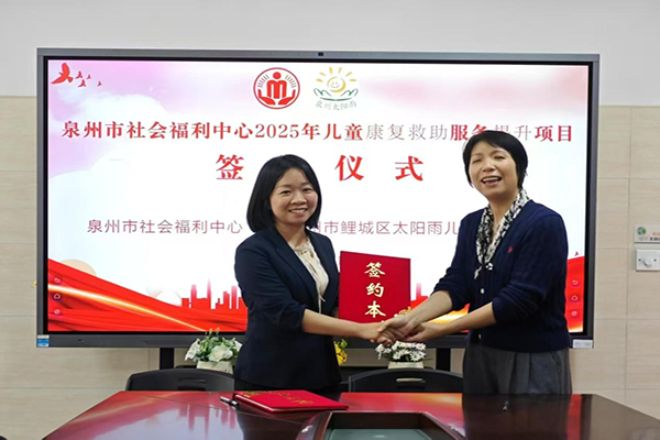 近日,泉州市社会福利中心与泉州市鲤城区太阳雨儿童培训学校举行儿童康复救助服务提升项目签约仪式。泉州市社会福利中心主任陈春燕及相关科室负责人,泉州市鲤城区太阳雨儿童培训学校校长林丽萍及项目执行人员共同参与活动。签约仪式上,双方围绕智力障碍儿童的康复需求、资源整合、服务标准化建设等议题展开深入交流,并正式签订合作协议。据悉,20251月,泉州市社会福利中心已通过全面评审,纳入泉州市智力残疾儿童康复定点协议管理机构。机构配备智力测评室、康复训练室等十余个功能区域及专业团队,为智力残疾儿童提供康复服务。通过此次合作,构建从筛查评估到持续跟踪的全链条服务体系这也标志着泉州市社会福利中心智力残疾儿童康复定点协议机构迈入专业化、规范化新阶段,为智力障碍儿童实现功能改善、融入社会提供坚实保障。