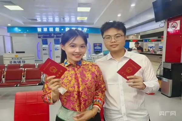 在工作人员的协助下,黄小姐换上了传统红底金花的惠女短上衣,汪先生则换上了白衬衫,两人并肩站在镜头前时,相视一笑的瞬间被定格成照片——这张带着浓郁惠女风情的结婚证件照,成了他们领证时最特别的纪念。
