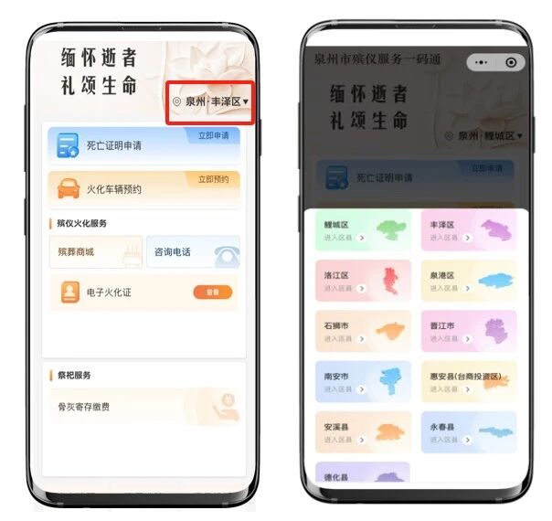 进入泉州市殡仪服务“一码通”小程序漫蛙漫画,即可定位到所属地区,也可根据实际情况选择地区。