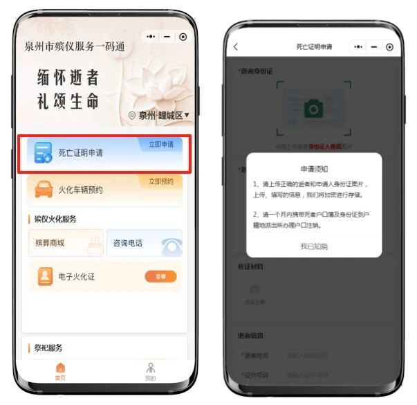 ①进入泉州市殡仪服务“一码通”小程序漫蛙漫画,点击“死亡证明申请”,进入信息提交界面后仔细阅读申请须知(数据加密说明、销户时间提醒)。