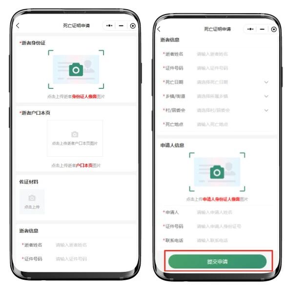 ②上传逝者身份证、户口本页图片(可附加上传讣告图片佐证材料)以及申请人身份证,填写其他正确信息后,点击“提交申请”即完成流程。