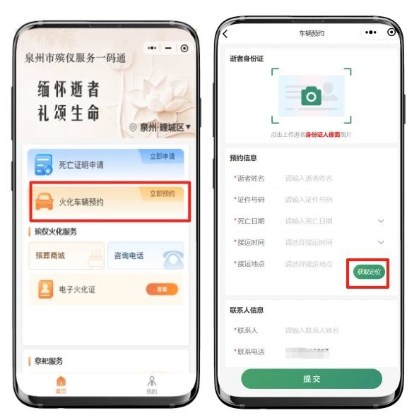 ①进入泉州市殡仪服务“一码通”小程序漫蛙漫画,点击“火化车辆预约”,进入信息提交界面后,上传逝者身份证图片。