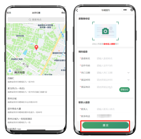 ②点击“获取定位”选择准确接运地点并填写其他正确信息后,点击“提交”即完成流程。