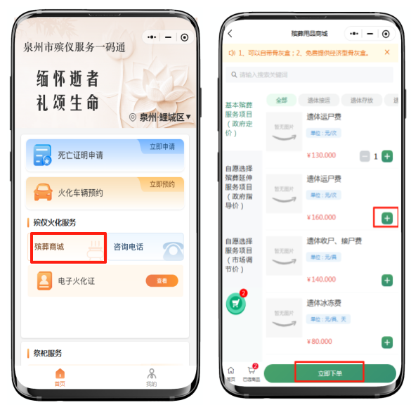 ①进入泉州市殡仪服务“一码通”小程序漫蛙漫画界面,点击“殡葬商城”,进入商城后选择需要商品加入购物车,选购完毕后点击“立即提交”