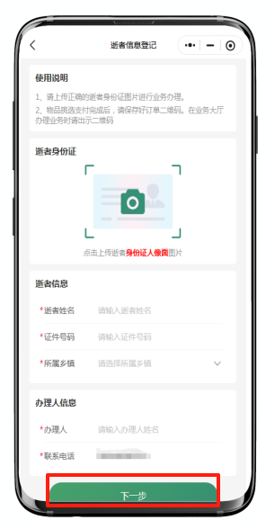 ②填写逝者信息及办理人后点击“下一步”进入付款页面,根据提示支付成功后完成商品购买。