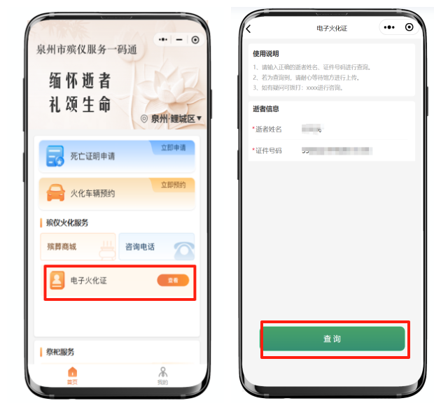 ①进入泉州市殡仪服务“一码通”小程序漫蛙漫画界面,点击“电子火化证”,进入电子火化证页面后,填写逝者姓名及身份证号码,即可查询逝者的电子火化证。