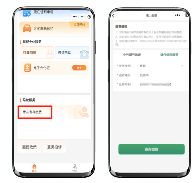 ①进入泉州市殡仪服务“一码通”小程序漫蛙漫画界面,点击“骨灰寄存缴费”,进入骨灰寄存缴费页面后,选择业务类型,填写逝者姓名、证件号码,点击“查询缴费”获取缴费信息。