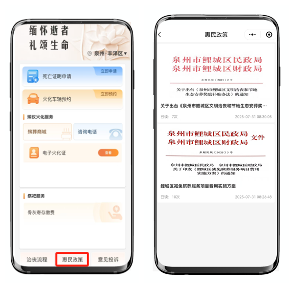 进入泉州市殡仪服务“一码通”小程序漫蛙漫画界面,点击“惠民政策”即可查看惠民政策文件。