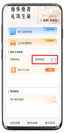 进入泉州市殡仪服务“一码通”小程序漫蛙漫画界面,点击“咨询电话”即可拨打所在地区殡仪馆电话。