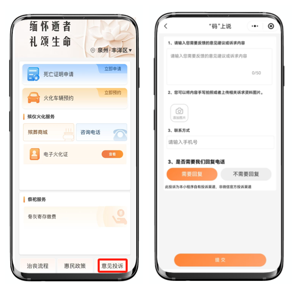 进入泉州市殡仪服务“一码通”小程序漫蛙漫画界面,点击“意见投诉”即可填写意见建议或诉求内容。