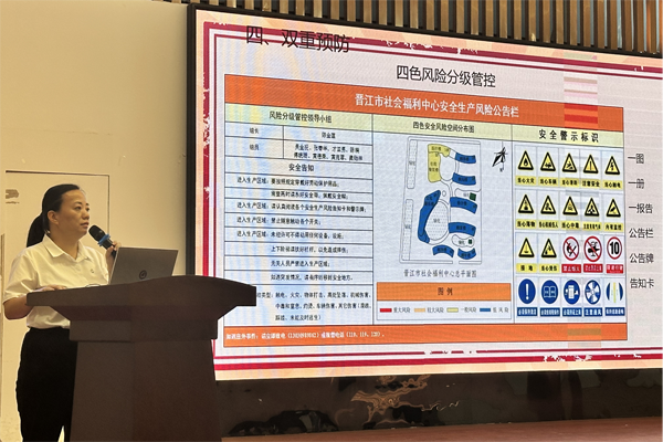 会议通报了全市养老服务领域安全生产形势,并对下一阶段安全重点工作进行部署强调。会议指出,要坚决守牢安全底线,以此次观摩调度会为契机,积极推广晋江市社会福利中心等标杆单位的成功经验,持续提升全市养老服务机构安全生产和消防安全标准化建设水平,推动安全管理制度化、规范化、常态化。要狠抓隐患排查整治,紧盯国庆中秋等重要节点,立即组织开展拉网式安全大排查,全面堵塞安全漏洞。要全面加强养老服务从业人员培训与能力建设,组织各养老机构认真学习民政部最新印发的《养老机构突发事件应急预案》,结合实际修订完善预案,扎实开展实战化应急演练,切实提升应急处置能力。同时,要加强应急值守,严格执行24小时值班制度。